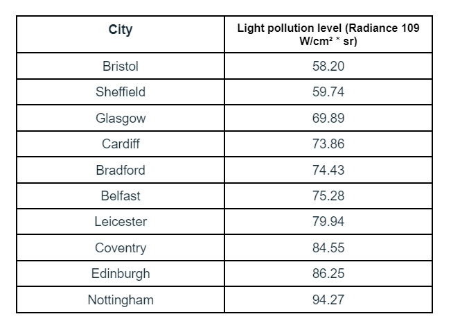 The table below shows the 10 top cities in the UK for stargazing determined by the levels of light pollution in the night sky.